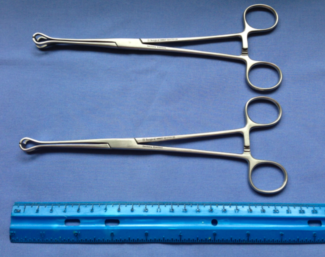 Preferred for clamping of ovarian pedicals during an ovariohysterectomy surgery because the serrations run longitudinally (see below).