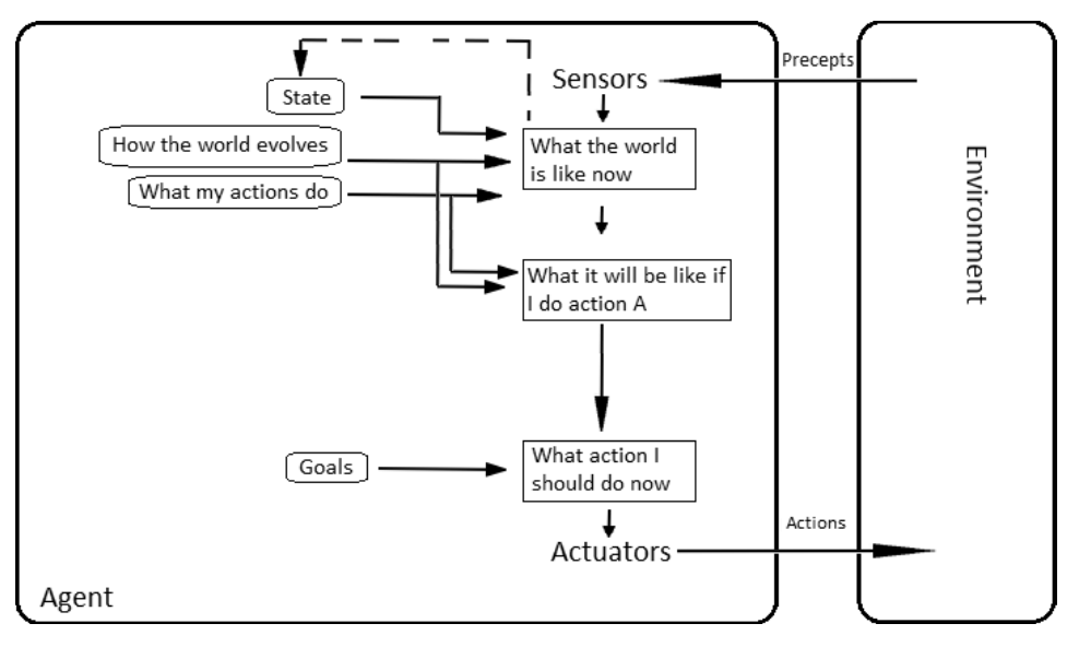A model-based agent can handle a partially observable environment. Its current state is stored inside the agent maintaining some kind of structure which describes the part of the world which cannot be seen. This knowledge about “how the world works” is called a model of the world, hence the name “model-based agent”.
