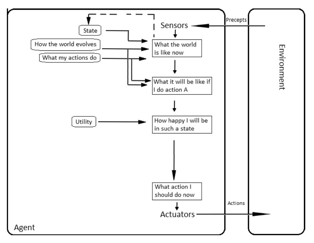 Goal-based agents only distinguish between goal states and non-goal states. It is possible to define a measure of how desirable a particular state is. This measure can be obtained through the use of a utility function which maps a state to a measure of the utility of the state. A more general performance measure should allow a comparison of different world states according to exactly how happy they would make the agent. The term utility, can be used to describe how “happy” the agent is.