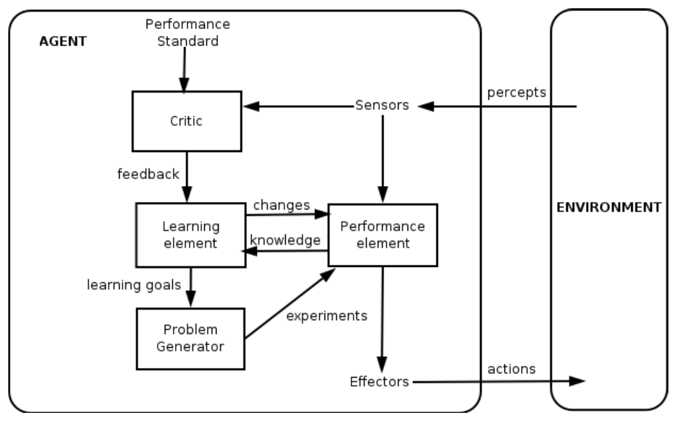 The learning element uses feedback from the “critic” on how the agent is doing and determines how the performance element should be modified to do better in the future. The performance element is what we have previously considered to be the entire agent: it takes in percepts and decides on actions.
