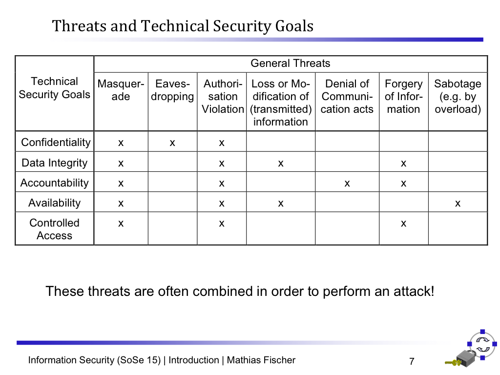 Explain the cross-table of Threats and Technical Security Goals: