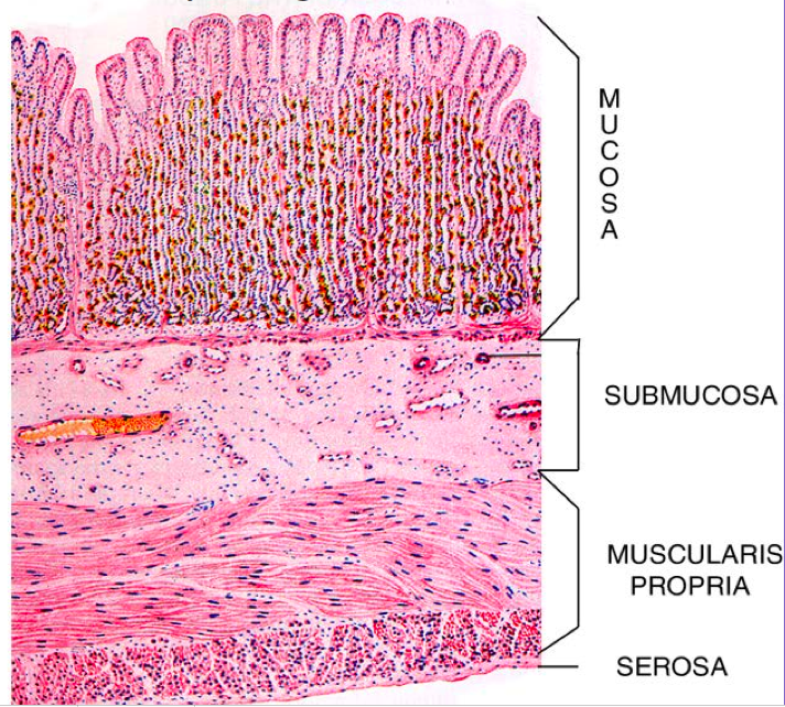 <p>OBJECTIVE: What are the 4 general layers of the gastric wall? What is their importance in the staging of gastric carcinoma?</p>