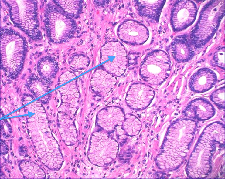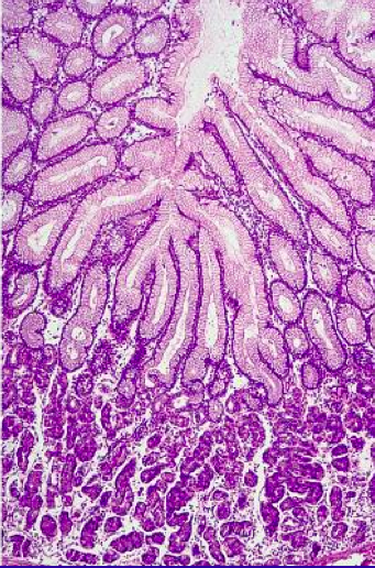 <p>There mucosa in the stomach varies depending on whcih part of the stomach you are in: the foveolar (superficial, mucin-producing) compartment remains the same, but the glandular compartment deep to it ∆s.</p>