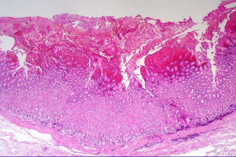 <p>erosion/loss of tissue that goes at least into submucosa</p>