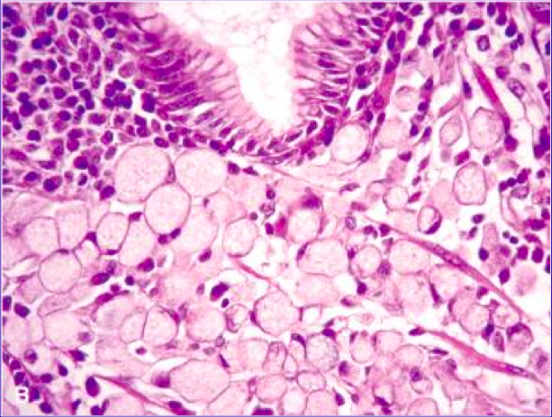 <li>> 50% of the cells in tumor have large mucin vacuole w/ a flattened peripheral nucleus that looks ring-like (see image here)</li>