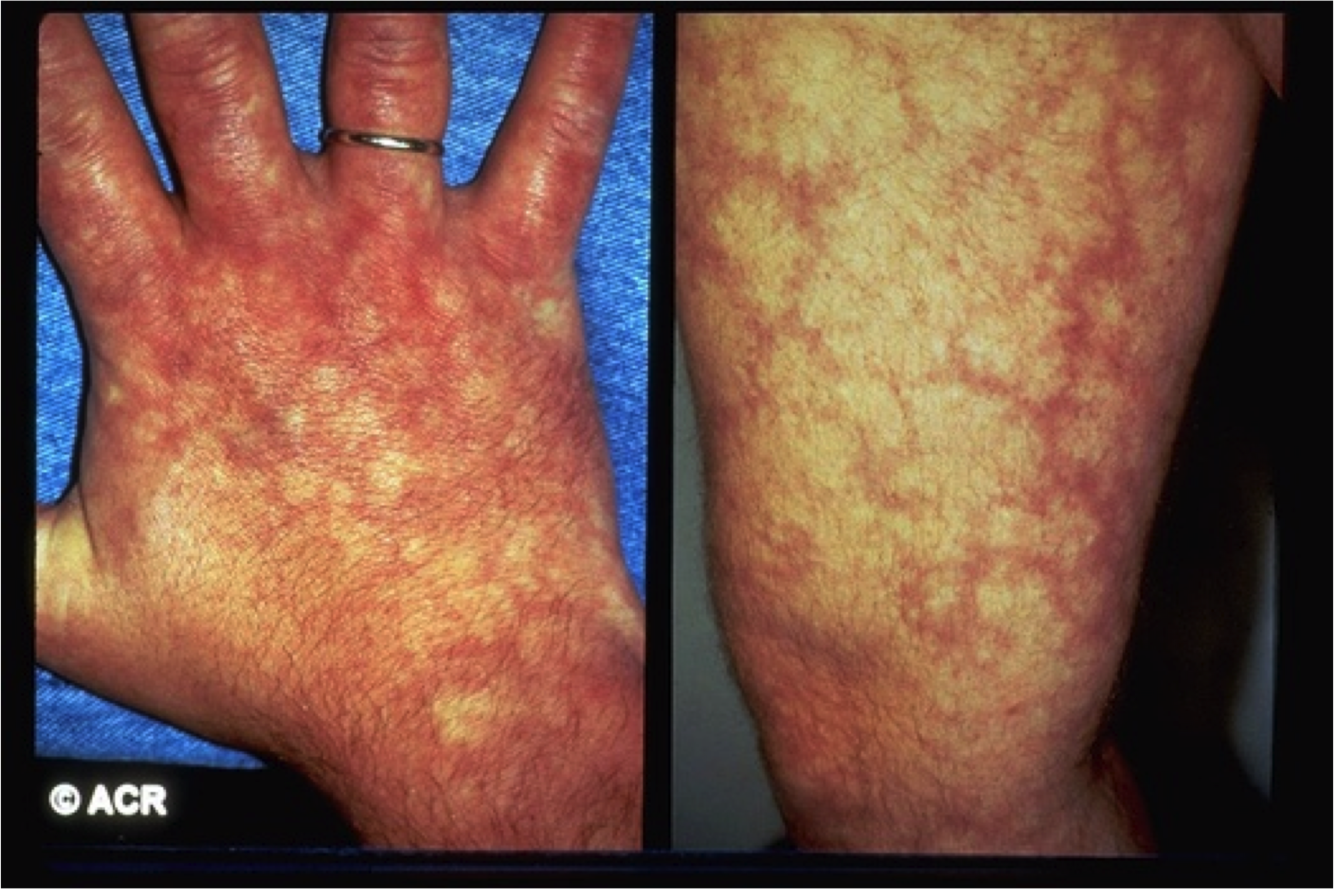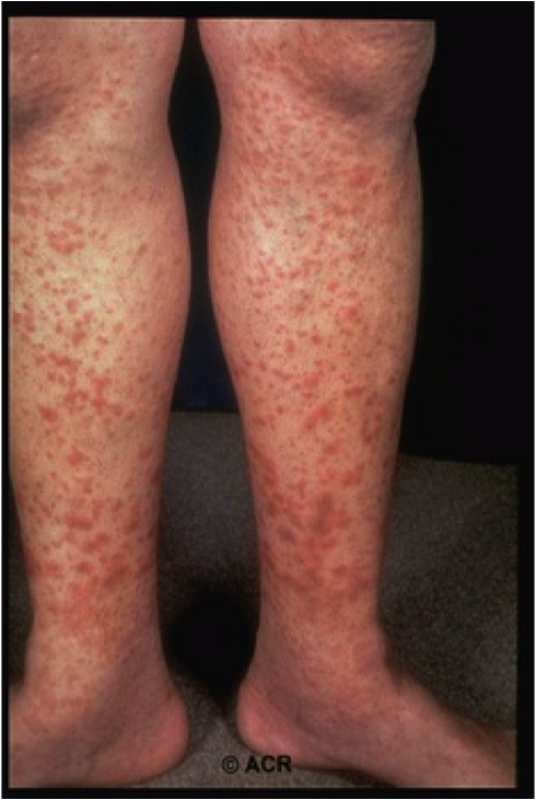 [A similar skin picture is found in vasculitis caused by drug reactions, other infections and in connective tissue diseases]