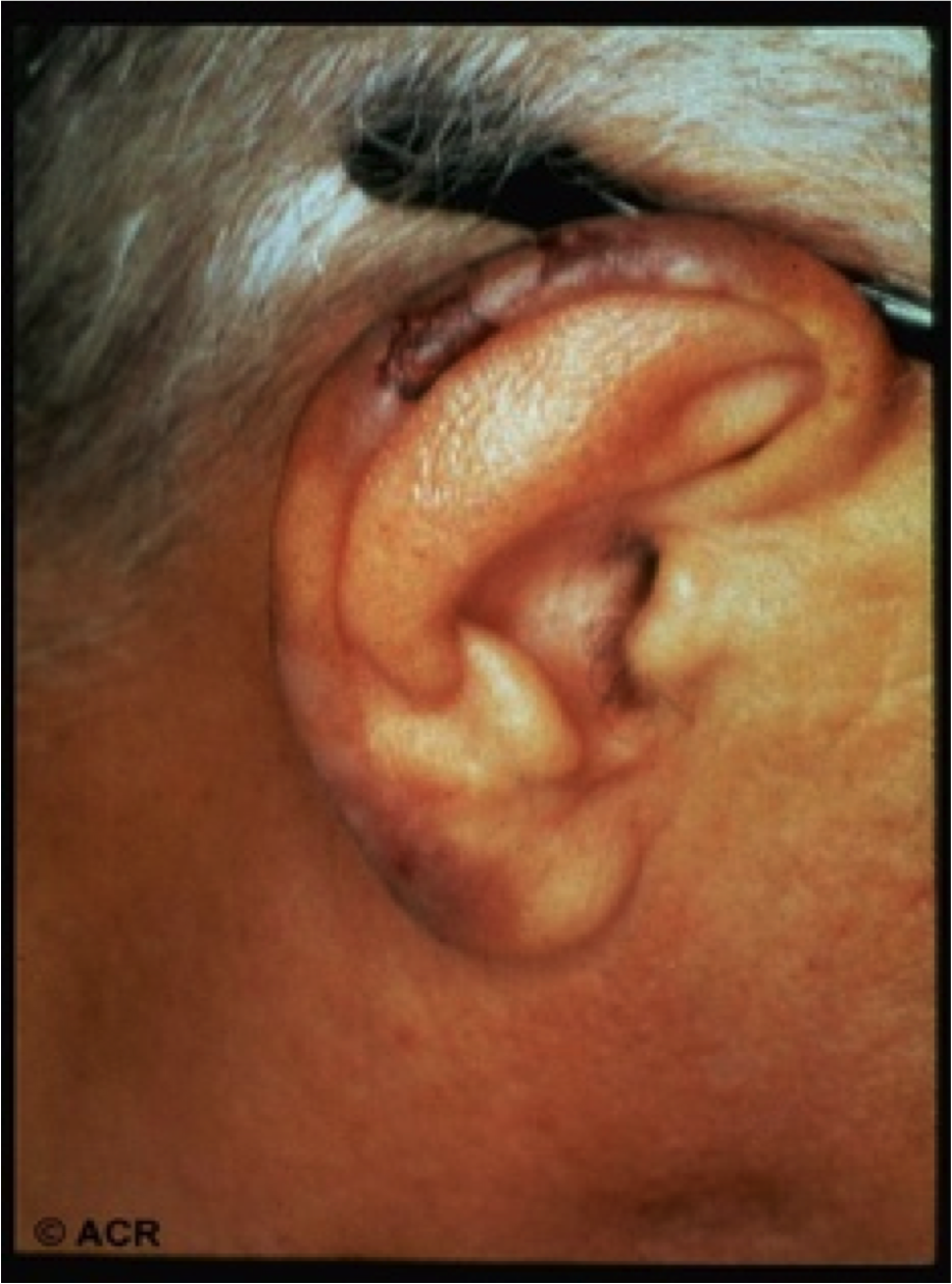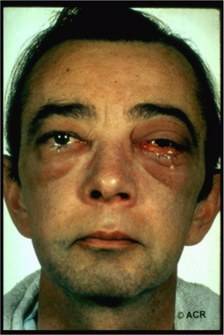 35 yo man is seen with eye inflammation [see image here], sinusitis, lung lesions, hemoproteinuria and gangrene of the fingers.