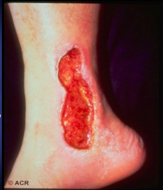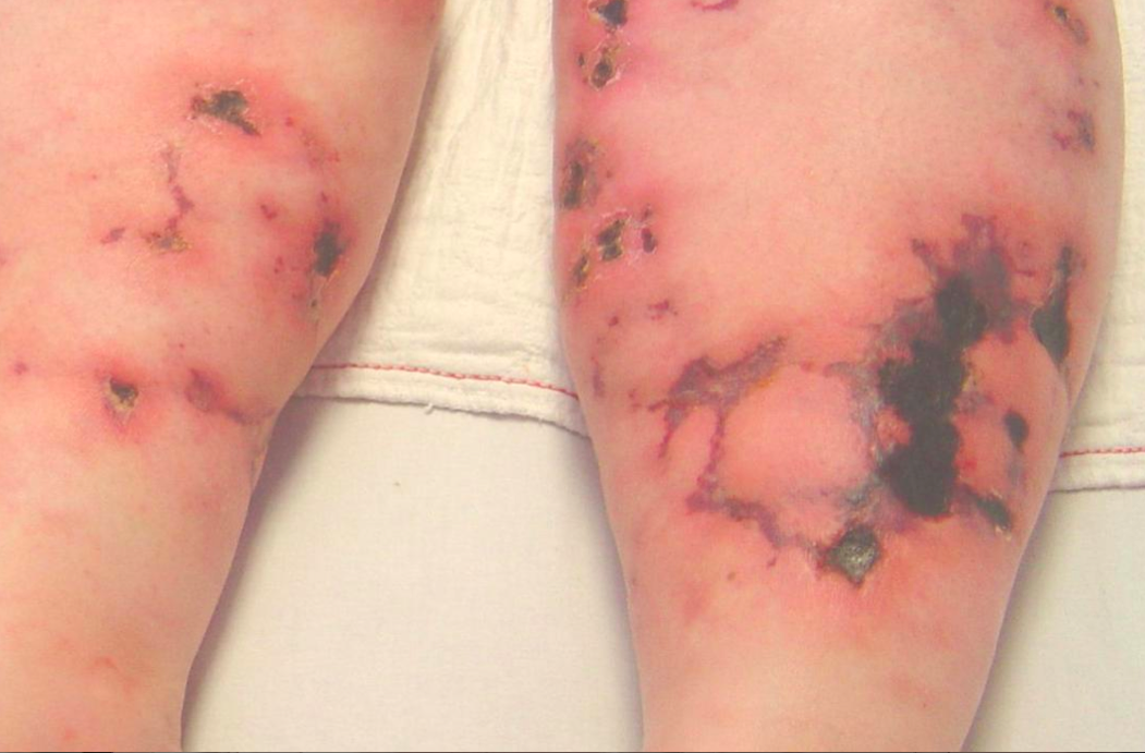 A 65 yo woman is seen with necrotic skin lesions on the thighs and calves, severe pain associated with the skin lesions and weight loss.