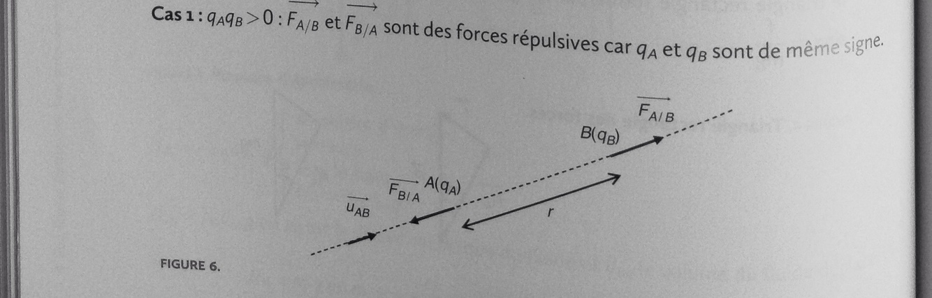 qAqB > 0 : →FA/B et →FB/A sont des forces répulsives car qA et qB sont de même signe