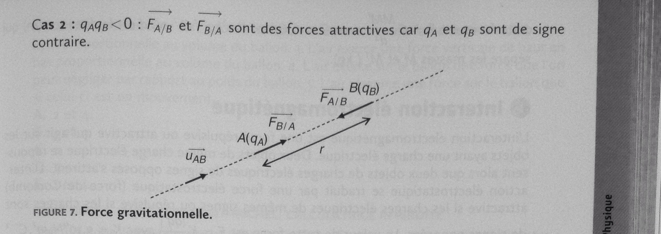 qAqB < 0 : →FA/B et →FB/A sont des forces attractives car qA et qB sont de signe contraire