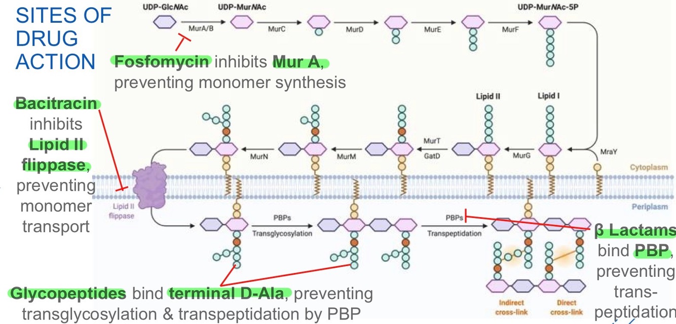 Monomer synthesis & transport: in cytoplasm, building blocks are made from amino acids & sugar by enzyme (Mur enzyme), then transported to the cell surface by lipid carriers.