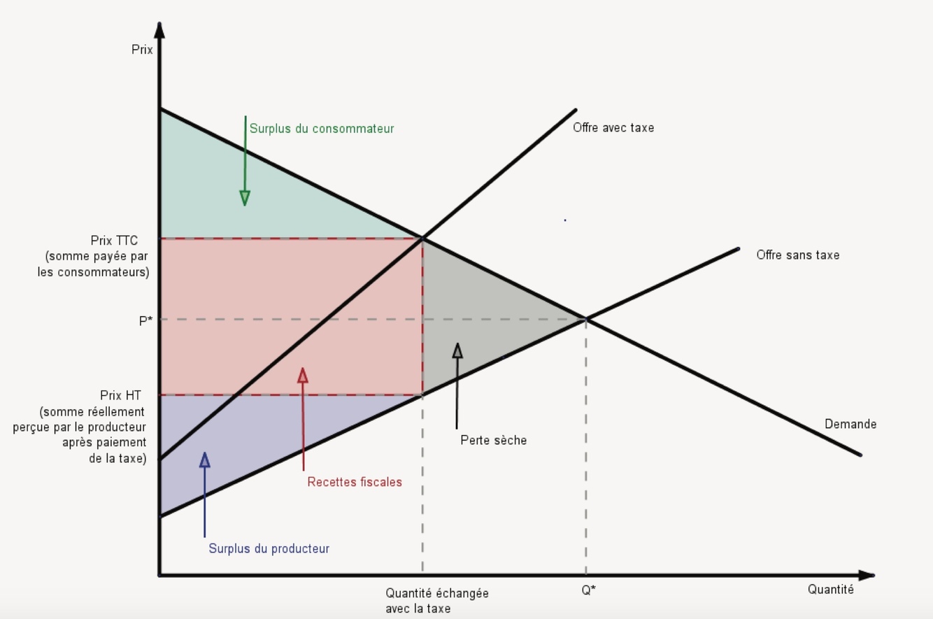 Représentation, dans un graphique d’offre et de demande, de la perte sèche (Deadweight loss) mesurant l’inefficience dans l’allocation des ressources.
