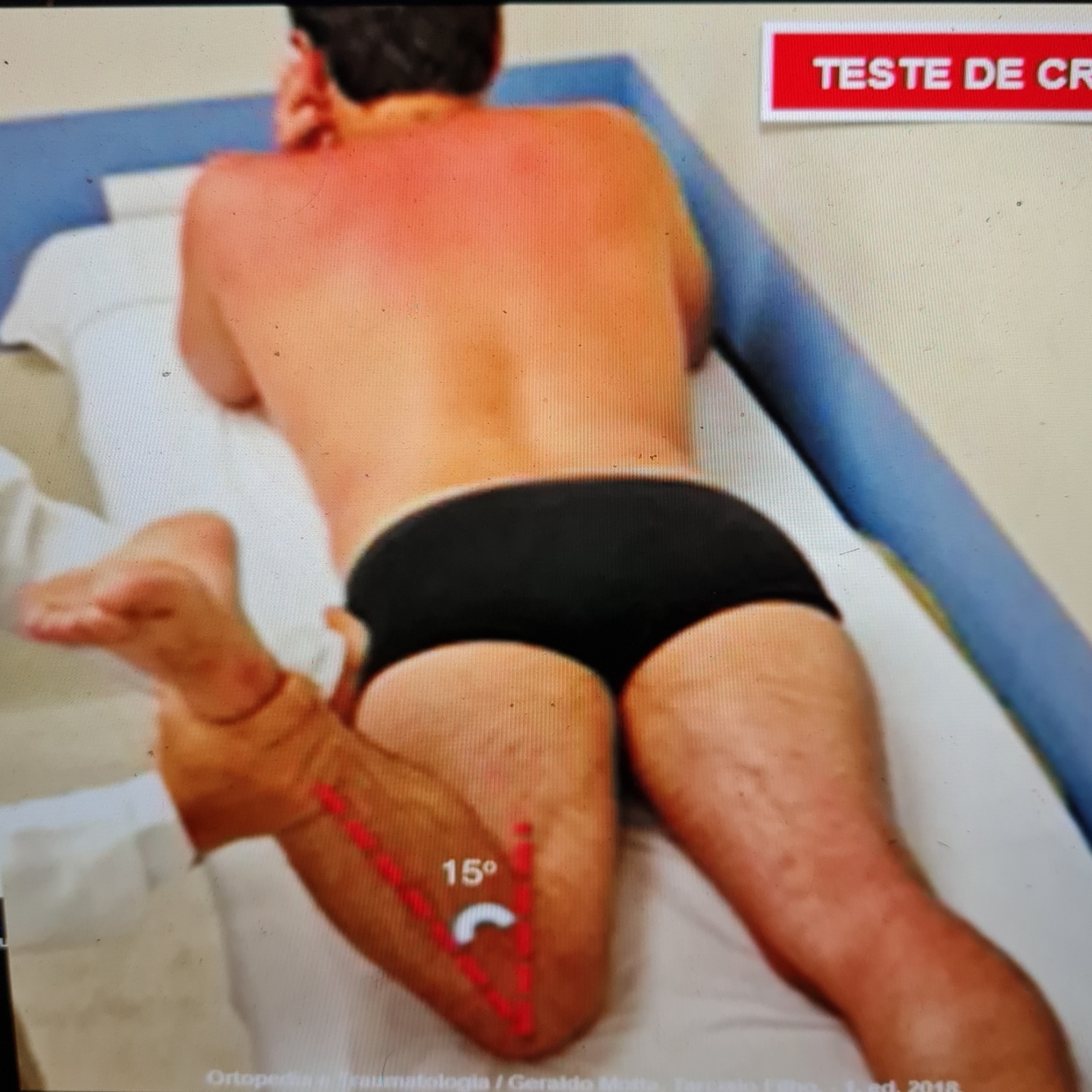 Paciente em decúbito ventral você realiza a Flexão passiva do membro avaliado em direção ao glúteo. Paciente com contratura do reto femoral observa-se elevação da pelve para compensar