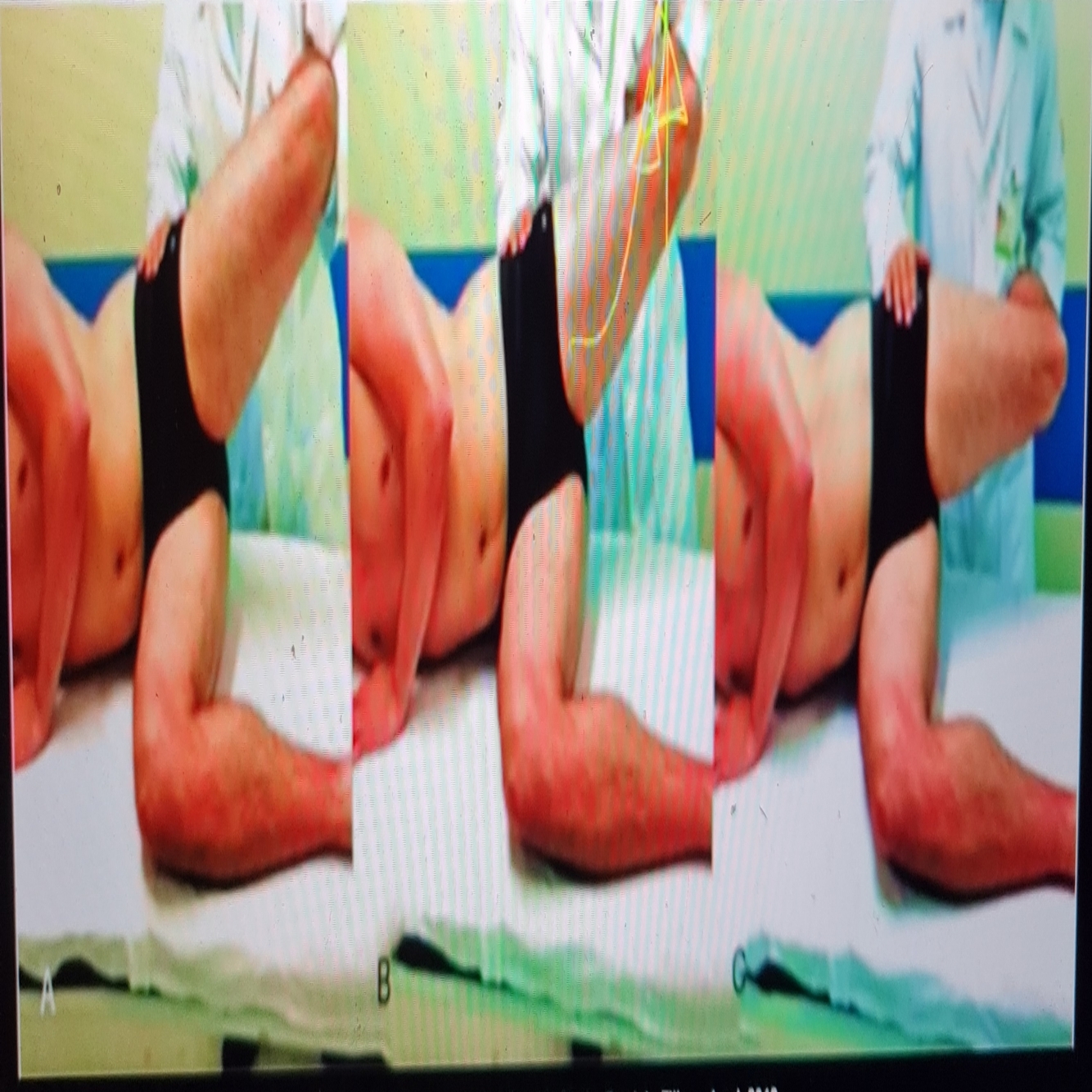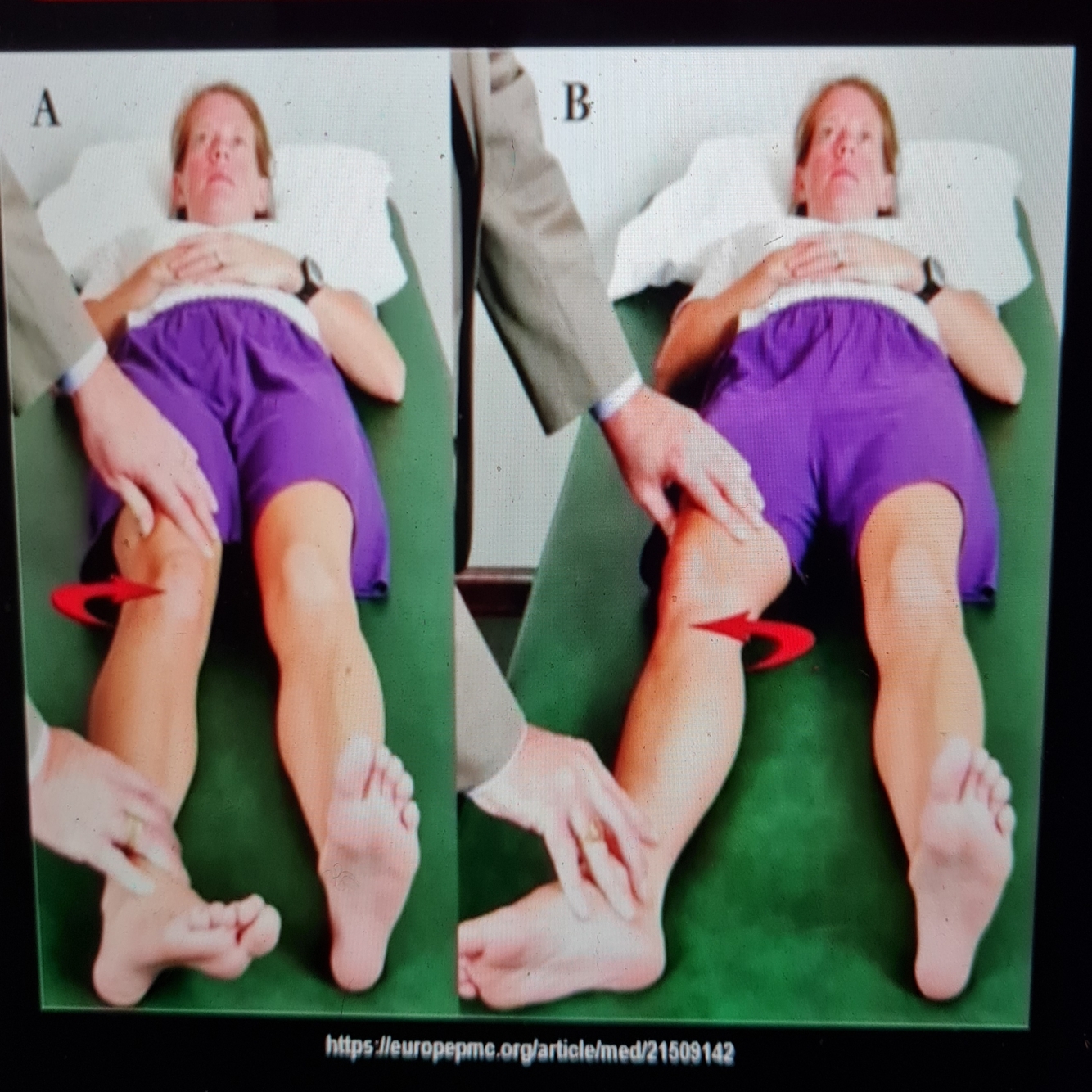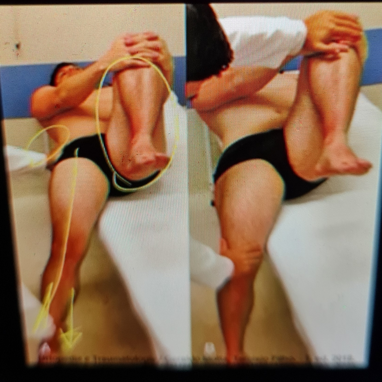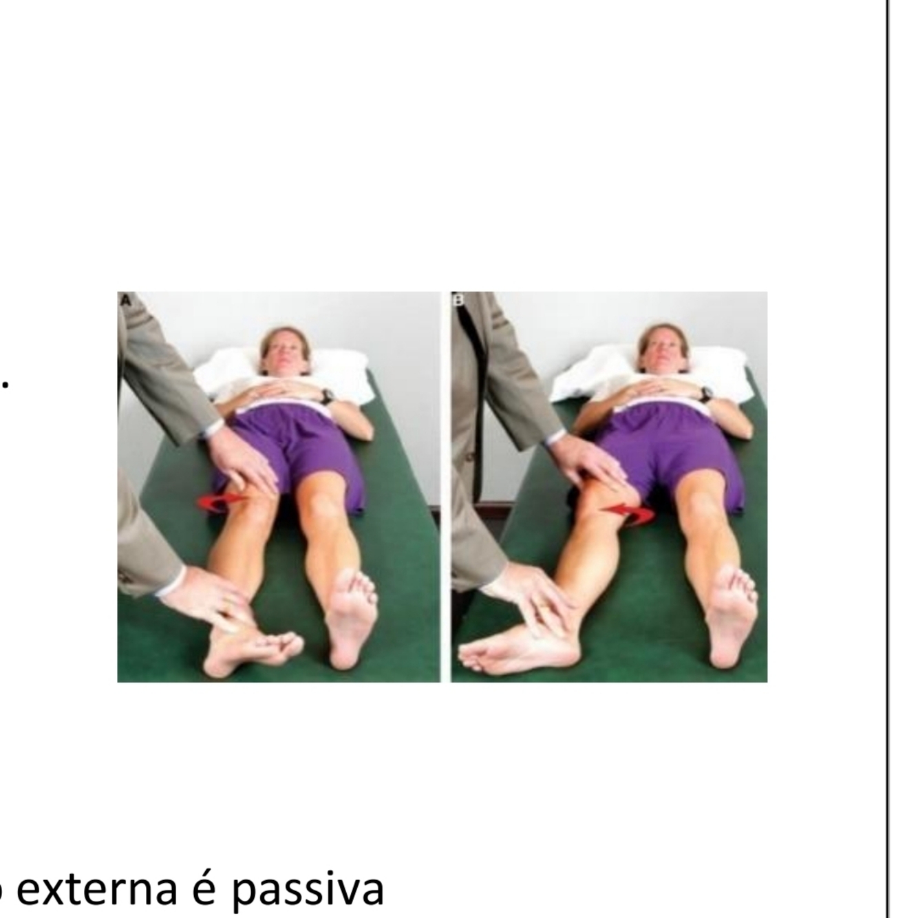 Paciente faz Flexão do quadril, Abdução e o médico faz passivamente rotação externa com fixação do quadril
