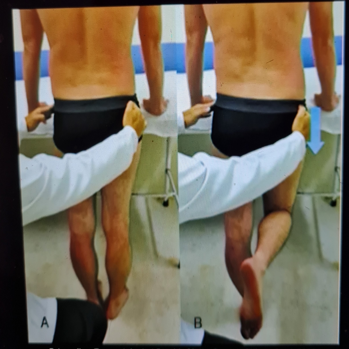 Abdução do quadril seguido de extensão com o membro contra lateral fletido. Após isso libera o paciente para fazer aducao e ele nao vai conseguir realizar