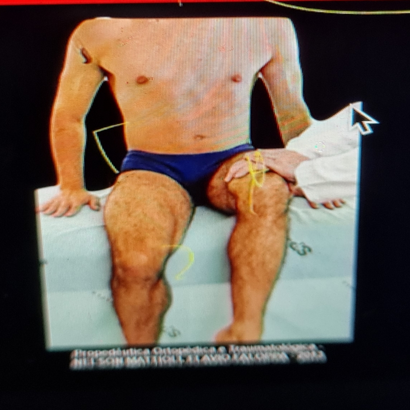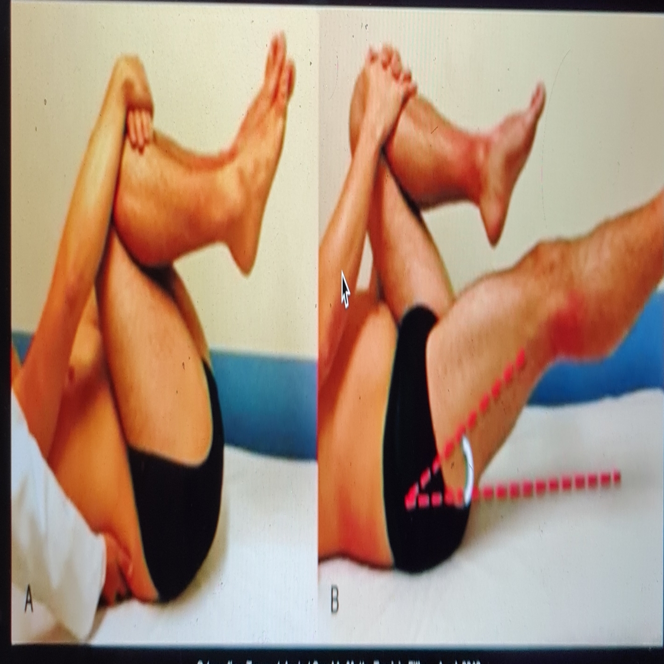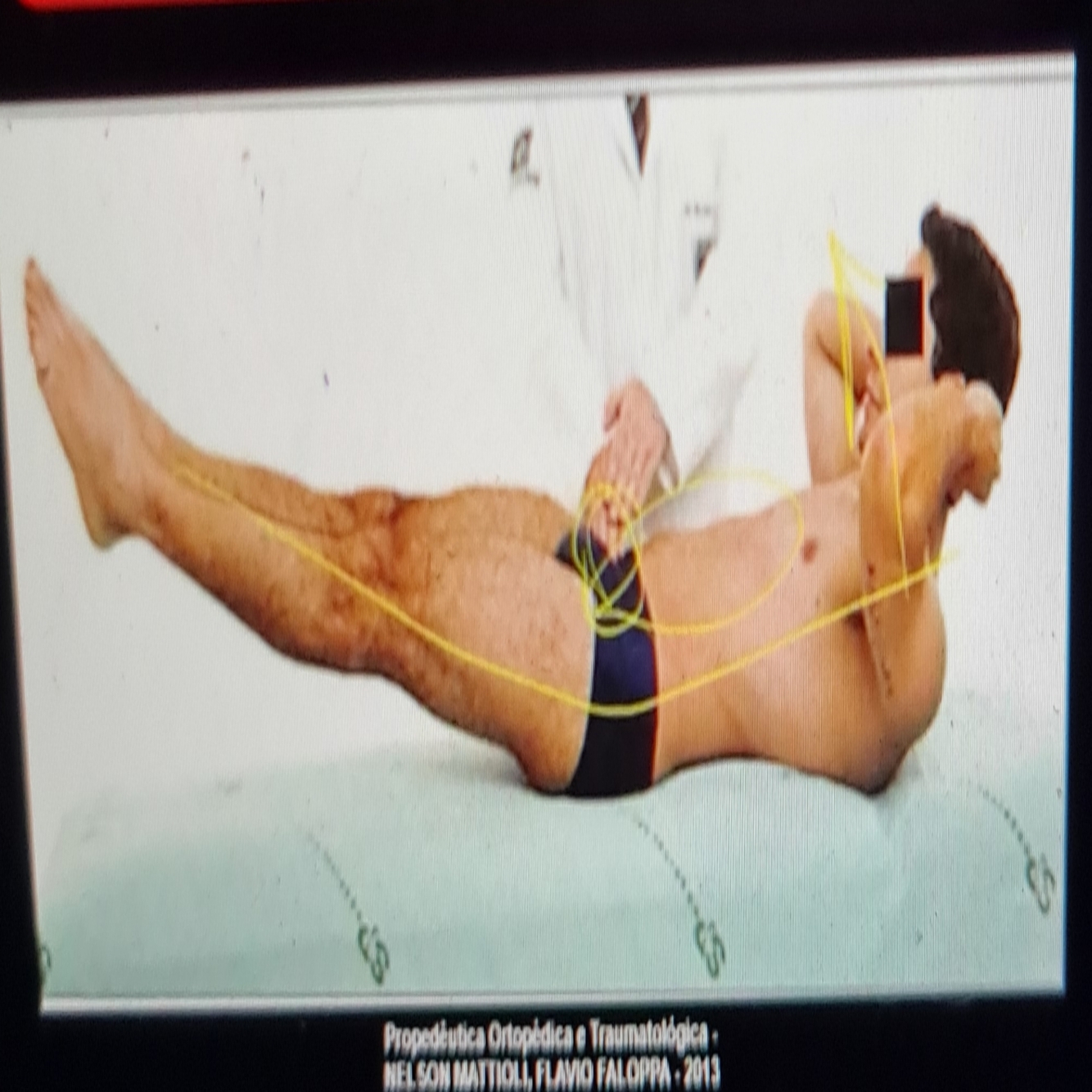 Paciente em decúbito dorsal faz Flexão e abraça ambos membros, quando sentir que a lombar tocou a mão = retificou a lordose fisiológica. O paciente mantém um lado segurando e extende a outra perna. Se houver contratura em Flexão do quadril ele não descerá tudo aí você mede o grau e avalia e compara com outro lado