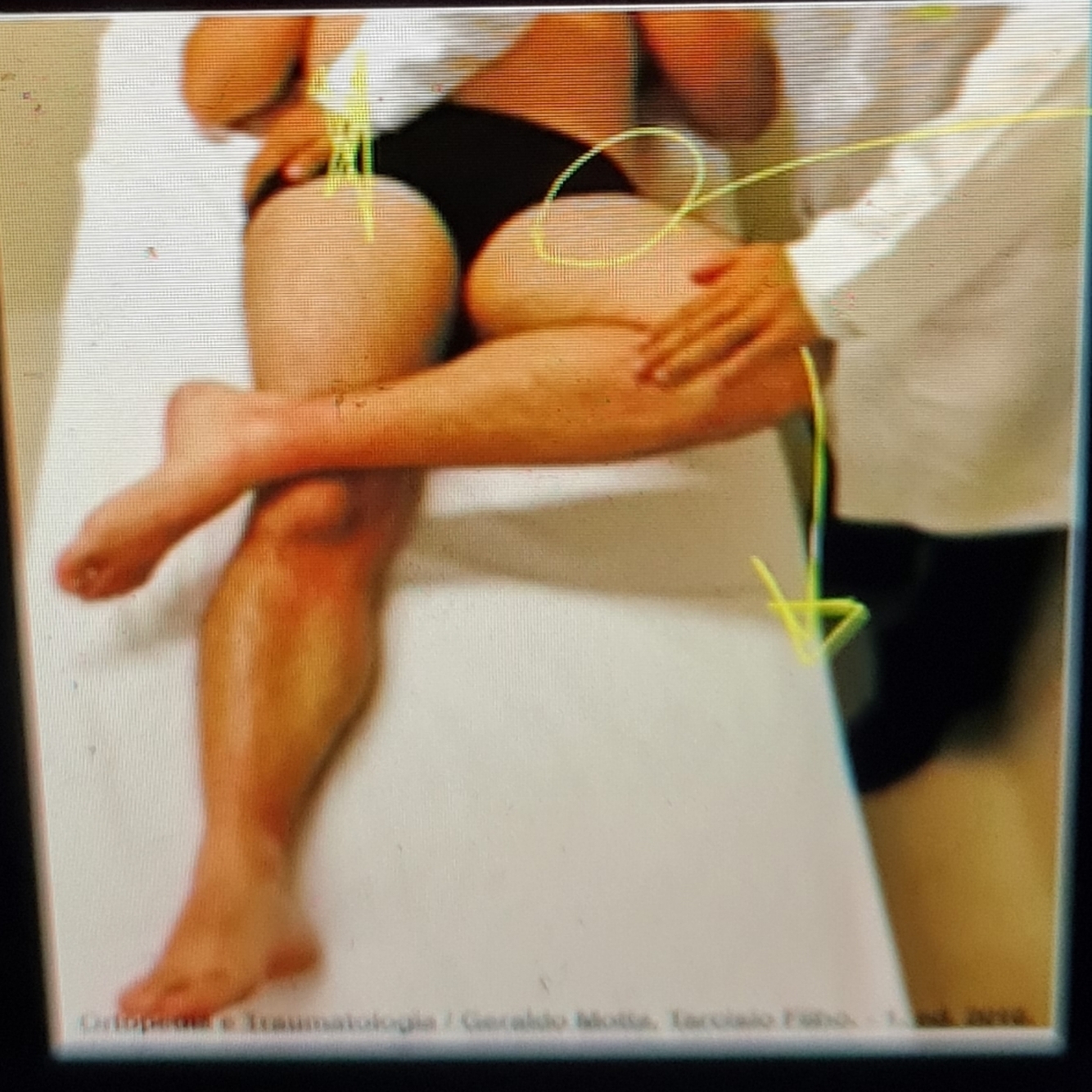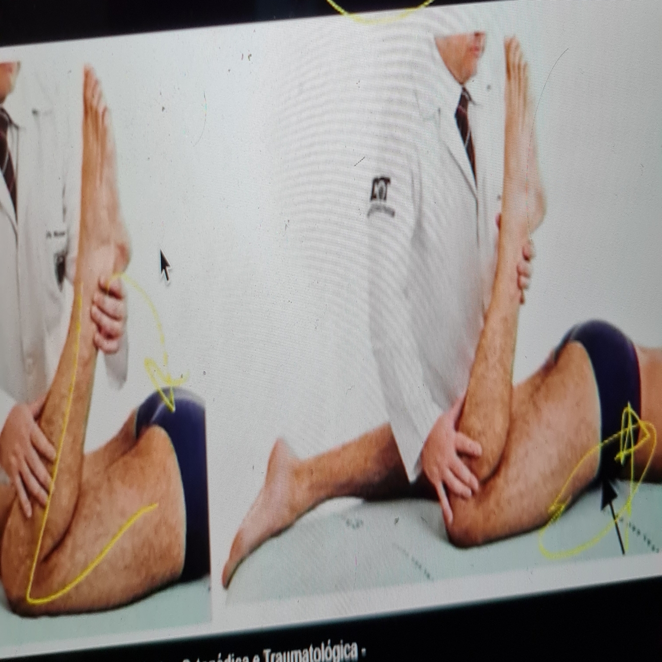 Paciente em decúbito dorsal realiza Flexão 90° do quadril com Flexão 90° joelho o médico tenta passivamente forçar o impacto com rotação interna + abducao do membro