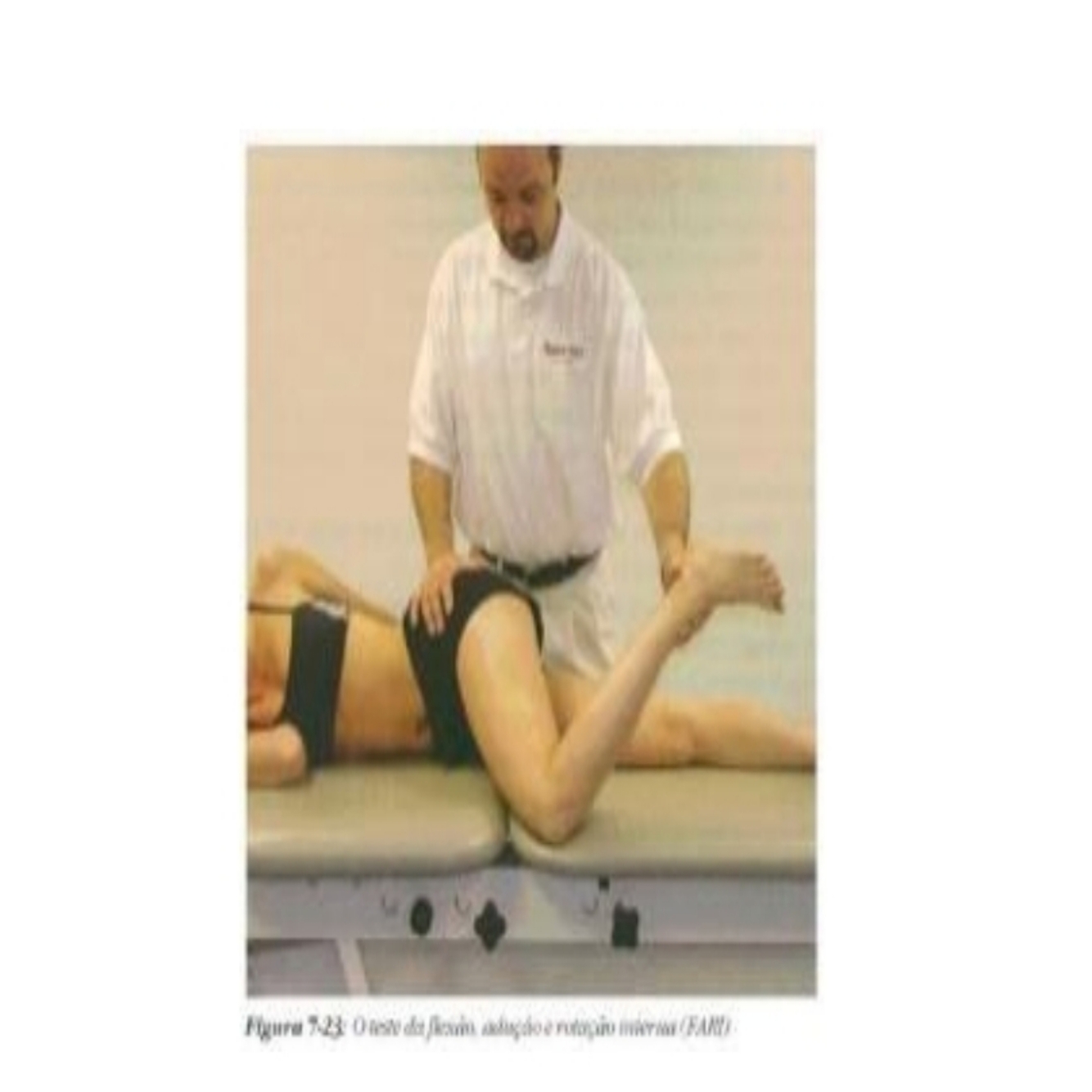 Flexiona o quadril, e o médico faz de forma passiva para o paciente a aducao com rotação interna. Se dor = positivo