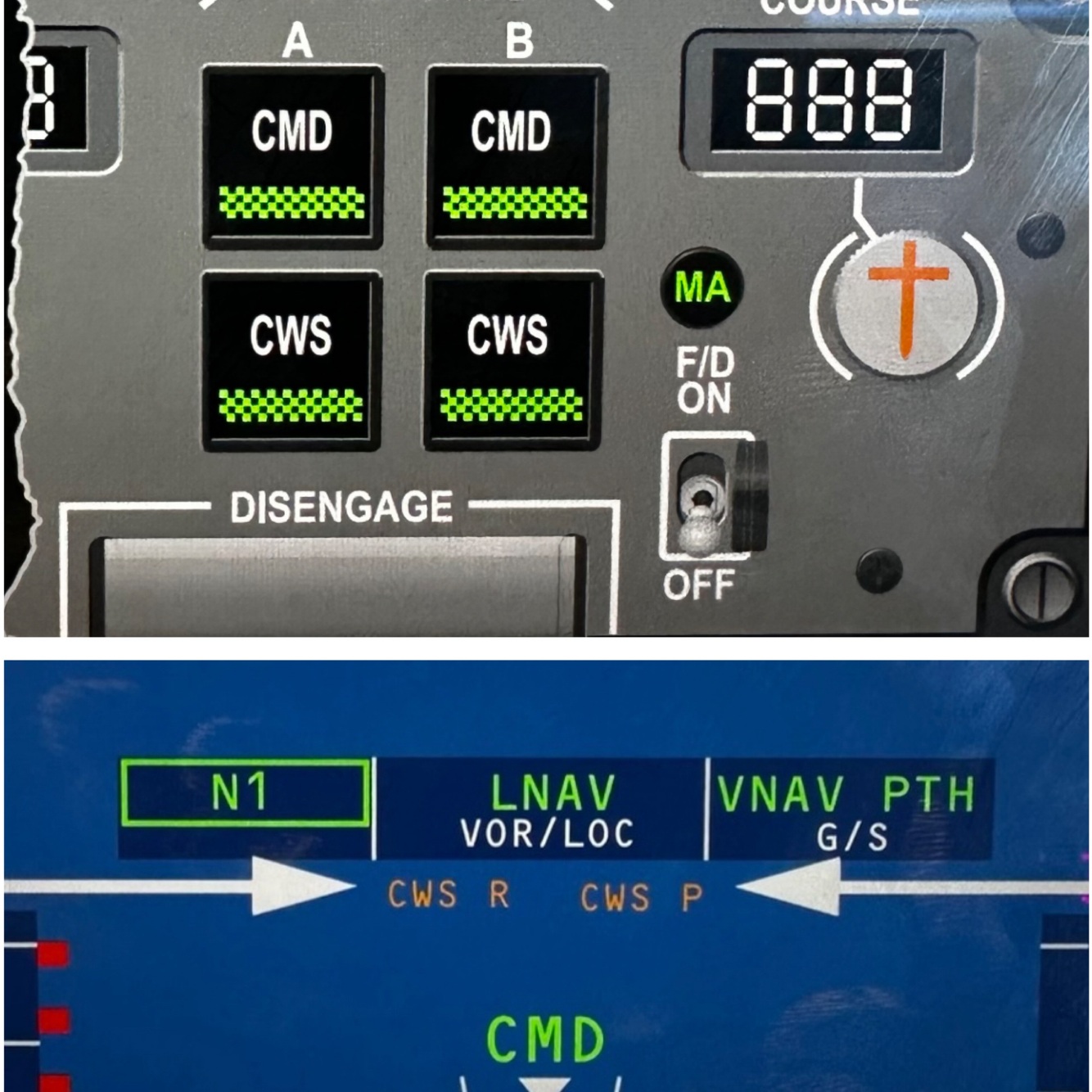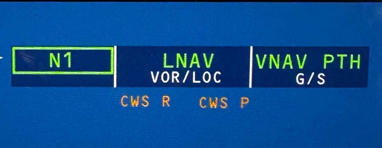 By display of CWS mode annunciation above the A/P status display and CWS R and/or CWS P, as appropriate, on FMA (with white box flashing for 10 sec).