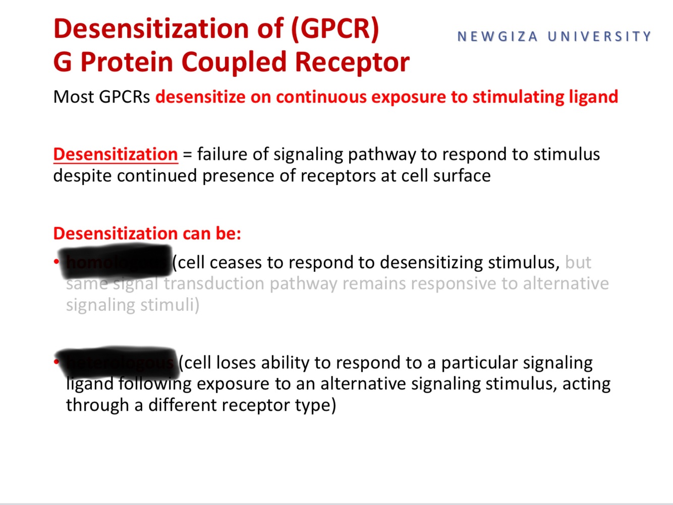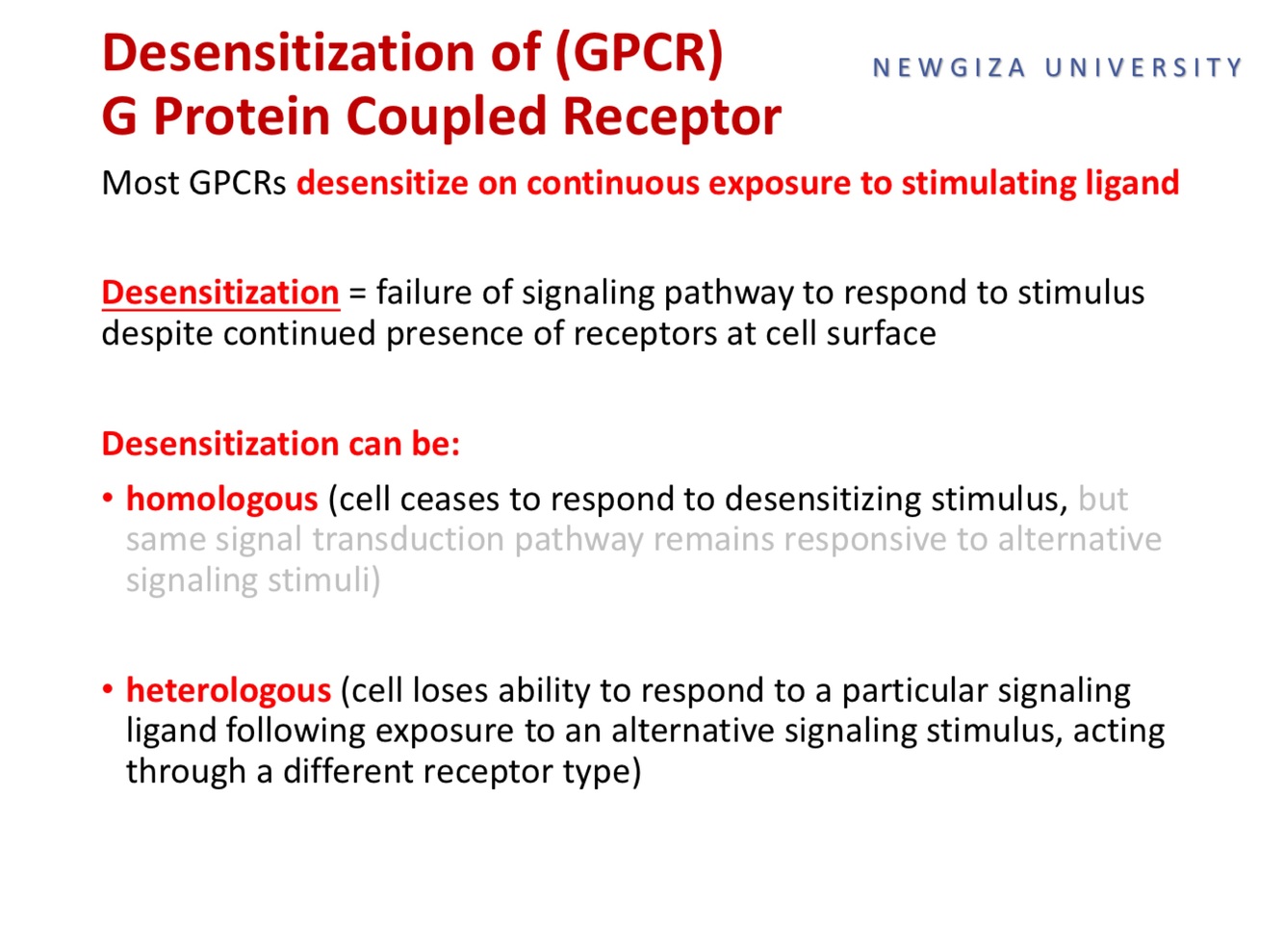Desensitization = failure of signaling pathway to respond to stimulus despite continued presence of receptors at cell surface
