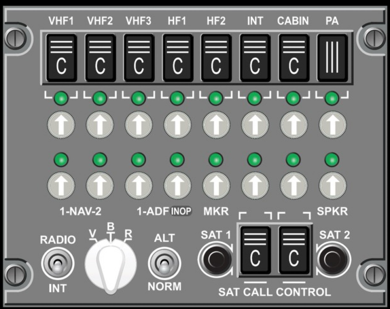 Pushing the ATTEND switch sounds a two-tone chime in the Passenger Cabin and illuminates both pink Master Call lights in the cabin