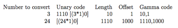Is decoded by reading the unary code up to the 0 that terminates it. Now we know how long the offset is. The offset can then be read correctly and the 1 that was chopped off in encdoded is appended.
