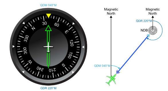 The cockpit displays indicate compass bearing to and from an NDB: