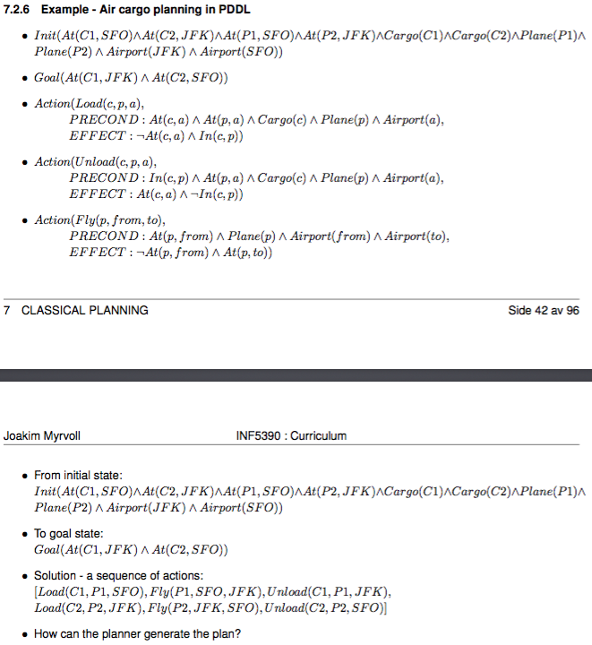 • Precondition: At(p, f rom) ^ Plane(p) ^ Airport(f rom) ^ Airport(to)