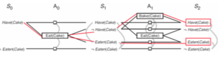 (image:) Alternating state and action layers. Real and “persistence” actions (small rectangles). Mutex links (grey arcs) btw. incompatible states. Graph levels off at S2 (states repeat themselves).