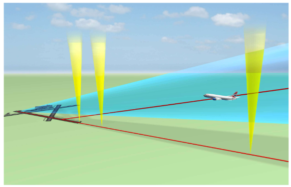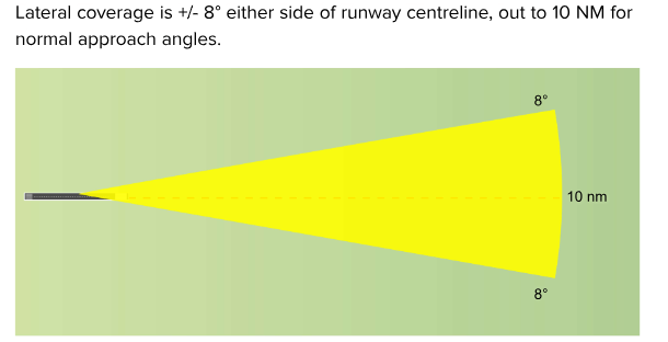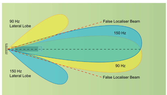 The LOC centreline is determined by two overlapping left and right beams (lobes), AM modulated at 90 Hz(Left Yellow) and 150 Hz (Right Blue) respectively.