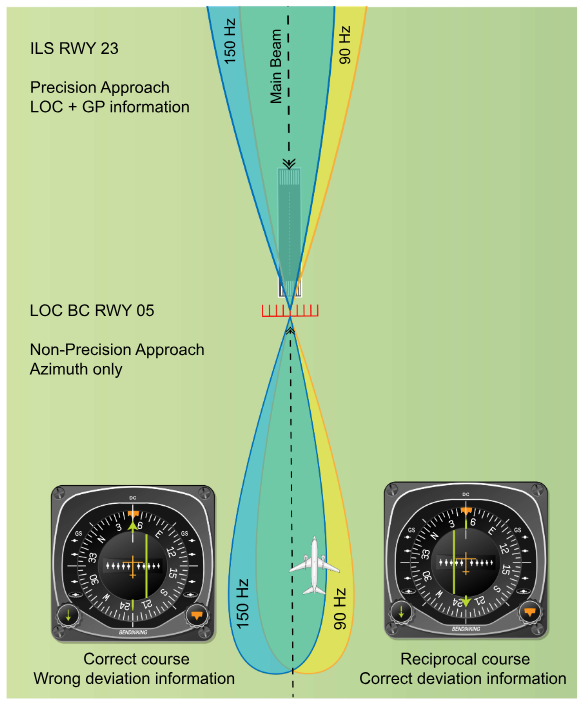 The LOC back beam can give reverse sensing indications on cockpit instruments.