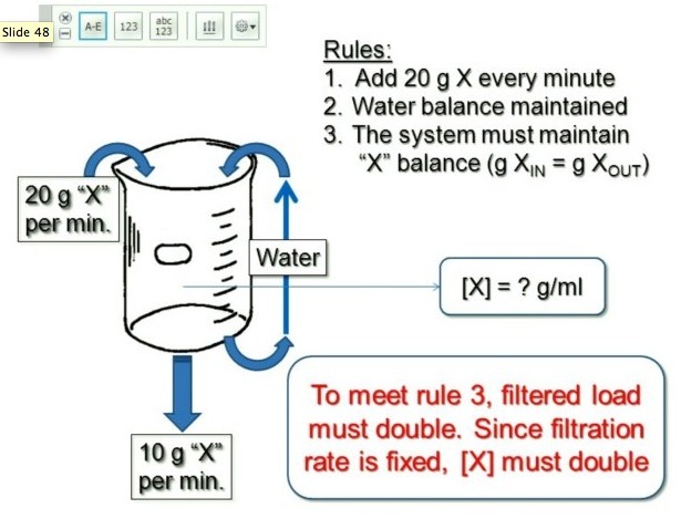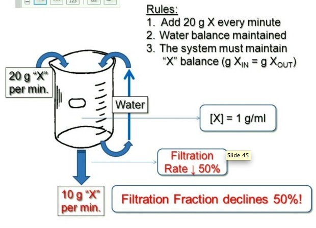 when the filtration rate goes down - the conc in the body or in the ebaker has got to go up in order to produce the same amount of excretion