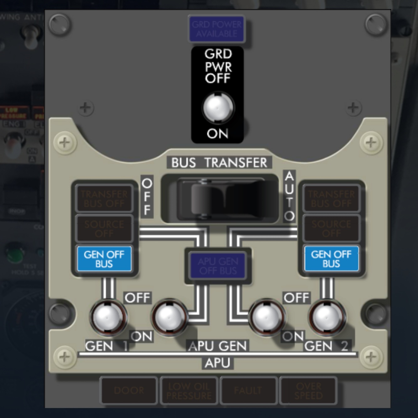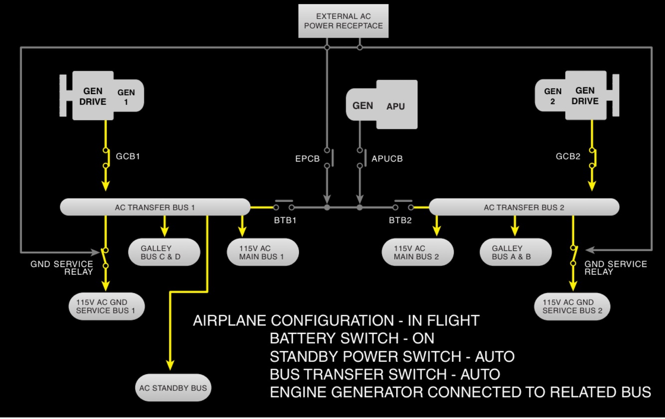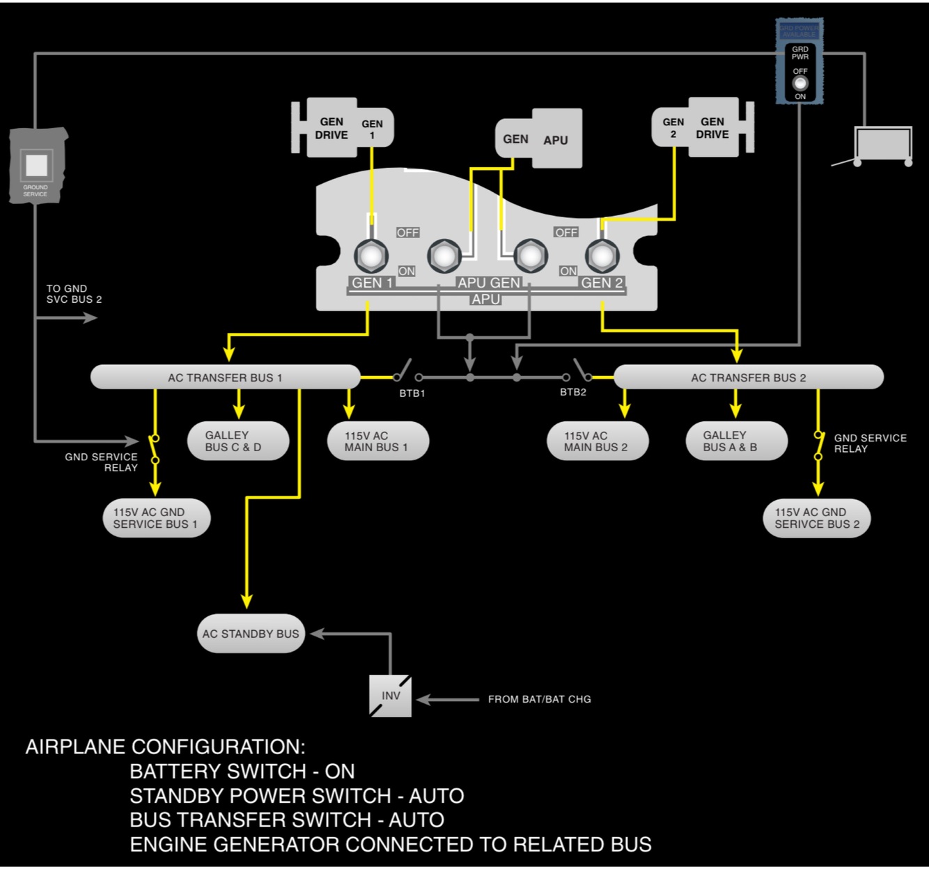 The system also incorporates an automatic generator on-line feature in case the aircraft takes off with the APU powering both Transfer Busses. If the APU is either shut down or fails, the engine generators are automatically connected to their related Transfer Busses.