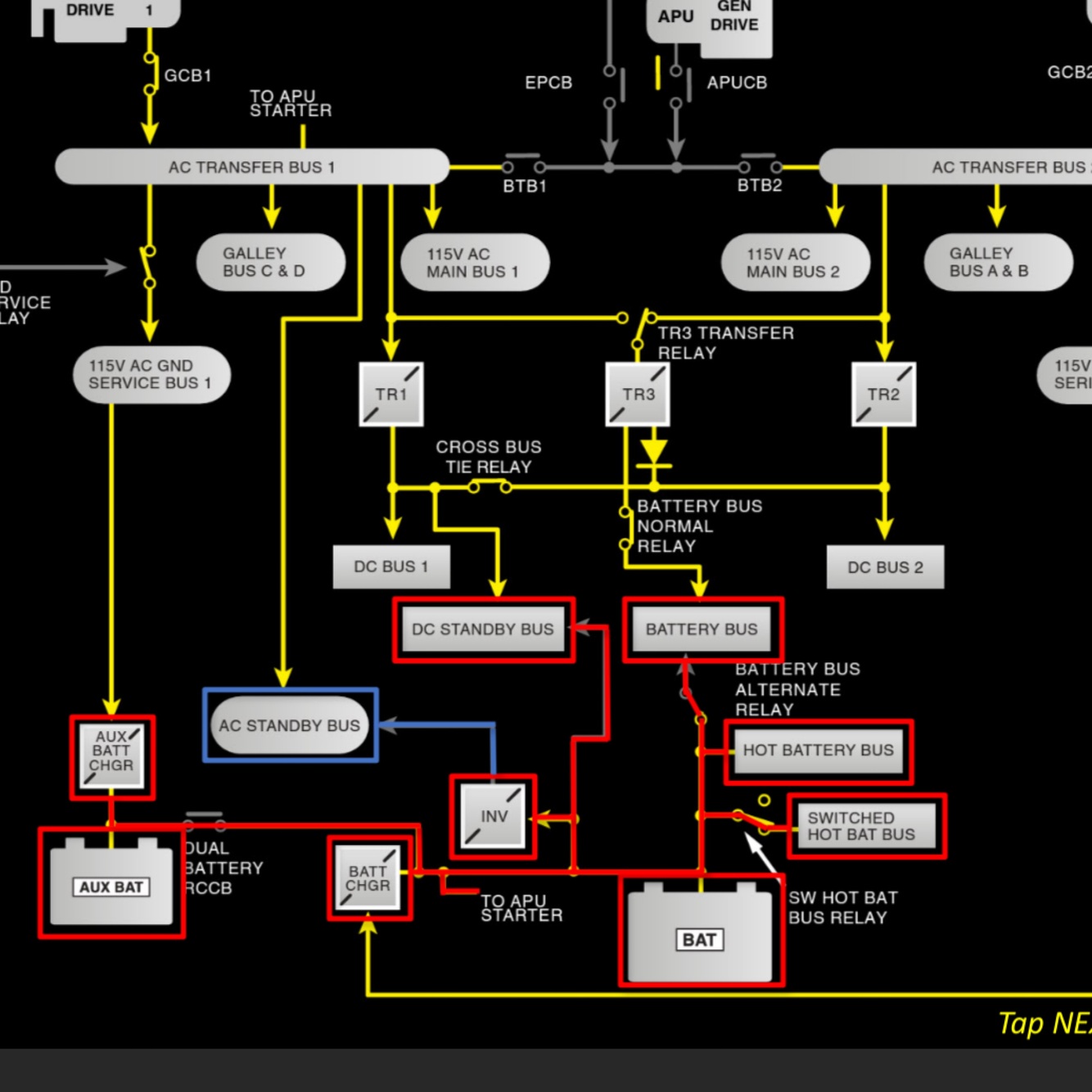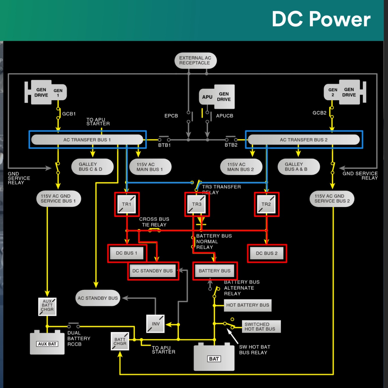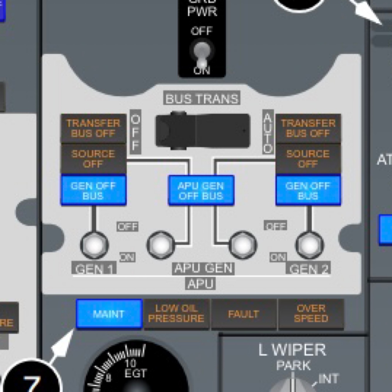 The system also incorporates an automatic generator on-line feature in case the aircraft takes off with the APU powering both Transfer Busses. If the APU is either shut down or fails, the engine generators are automatically connected to their related Transfer Busses.
