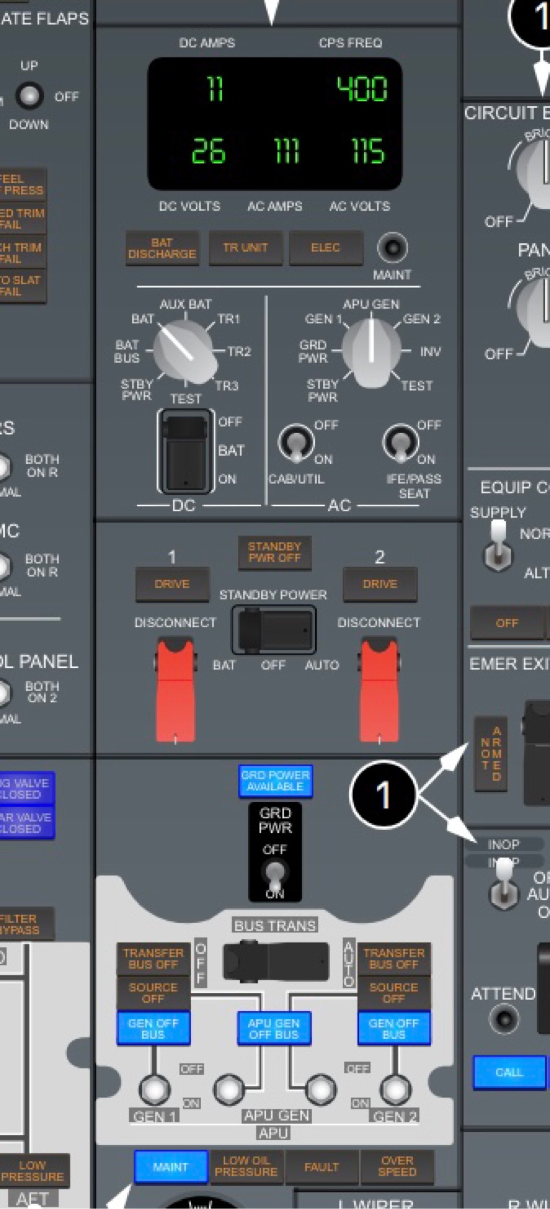 In flight, if the APU is the only source of electrical power, all Galley Busses and Main Busses are automatically shed. If electrical load still exceed design limits, both IFE Busses are also automatically shed. On the ground, the APU attempts to carry a full electrical load. If an overload condition is sensed, the APU sheds Galley Busses and Main Busses until the load is within limits. Manual restoration of Galley and Main Bus power can be attempted by moving the CAB/UTIL Power Switch to OFF, then back ON (on the ground).