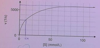 Sie messen für ein Enzym E und sein Substrat S folgende Reaktionsgeschwindigkeit v in Abängigkeit von der Substratkonzentration [S]. Wie groß sind für diese enzymatische Reaktion das vmax und die Michaelis-Menten-Konstante KM? Angaben bitte mit Einheiten.