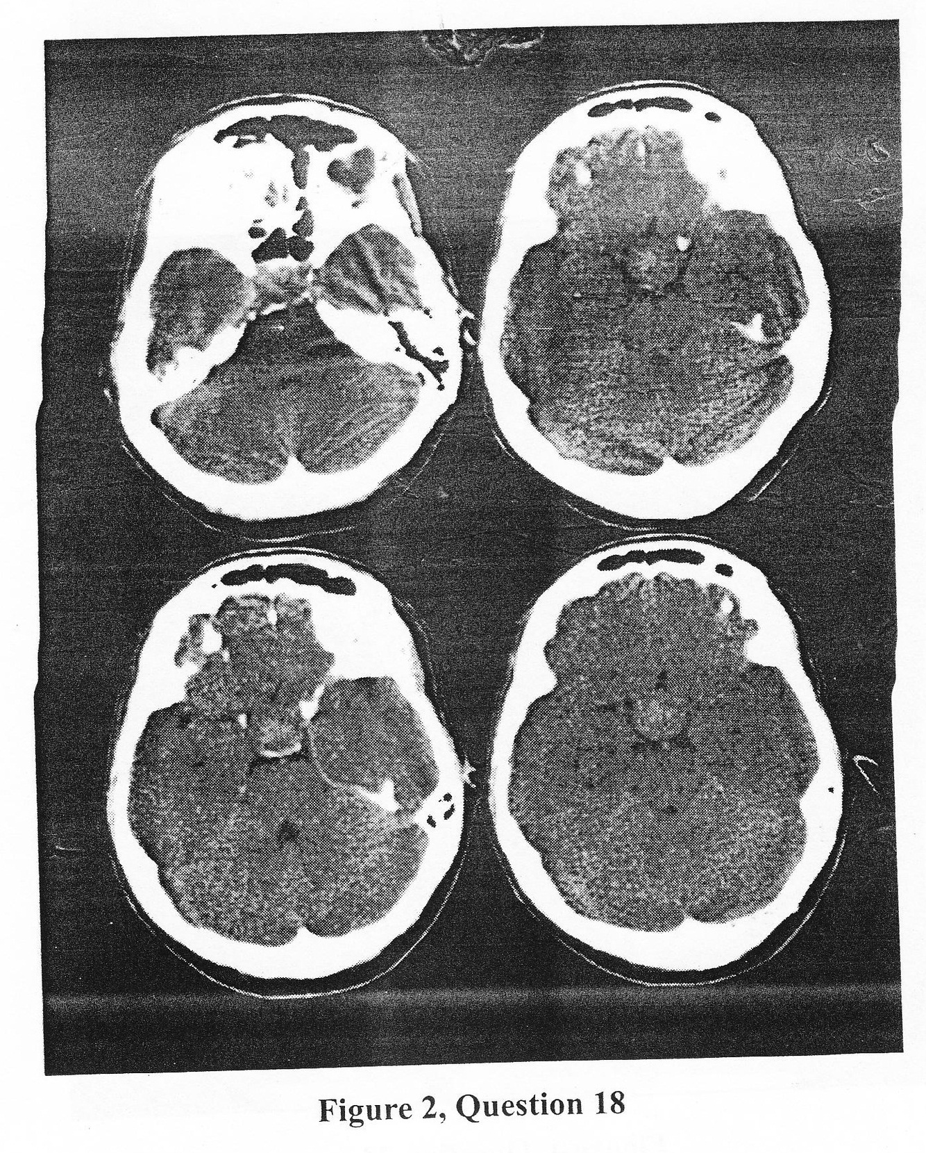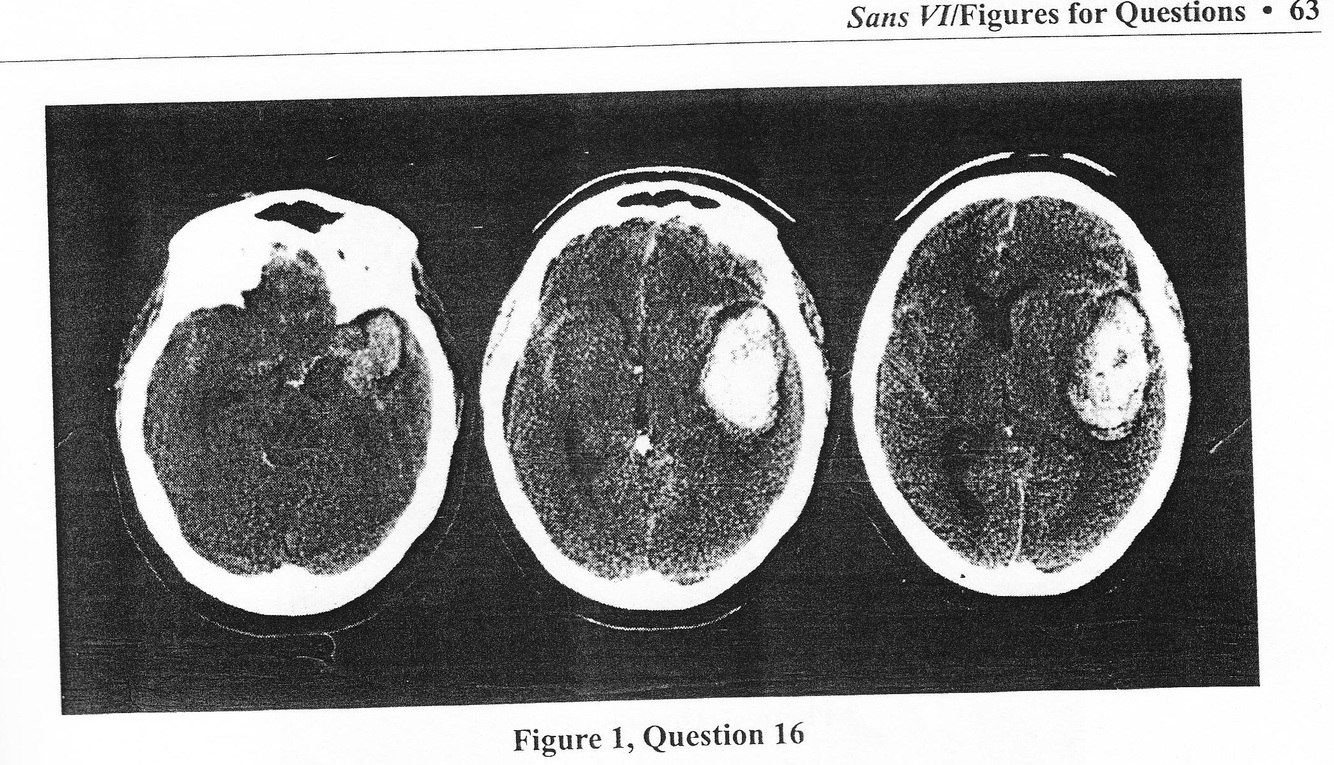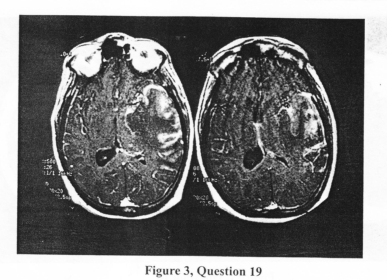 A 35-year-old wihte male complins of fever and headache. He begins to notice odd smell and his wife feels hisbehaviour is odd. Two days later he has a generalized seizure and is brought to the emergency room. On examination, you note a confused state with normal level of consciousness, right-sided weaness, and right Babinski sign. Intra cranial imaging is obtained (Figure 3). Cerebrospinal fluid (CSF) reveals 30 polymorphonuclear cells, protein of 120, glucose of 50. You NEXT : a. Begin intravenous acyclovir or equivalent agent, obtain an EEG, ask for a PCR on suspected agent DNA in CSF