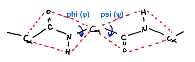 Partial double bond character prevents rotation about the CO-NH bond, resulting in only two rotatable bonds per amino acid residue. The atoms linked with red dashed lines define a virtual “plate”: they define the backbone conformation of the protein and most rotate together. Because of their significance they have been given names: phi and psi.