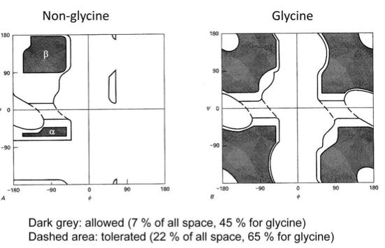 A way of visualizing allowed and non-allowed (Φ, Ψ) combinations. Only a small fraction of (Φ, Ψ) values are allowed, which allows only certain structures to form. These strucures are predictable, must satisfy the Ramachandran plot (lie in the gray regions), and arise from the way atoms are connected.
