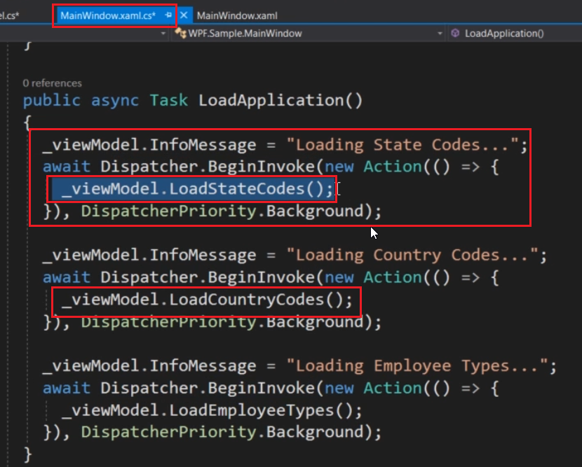 await Dispatcher.BeginInvoke (new Action( () => { _viewModel.LoadStateCodes;}),