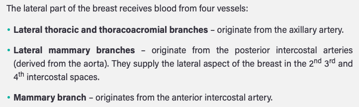 Medial: internal thoracic artery (a.k.a internal mammary from subclavian)