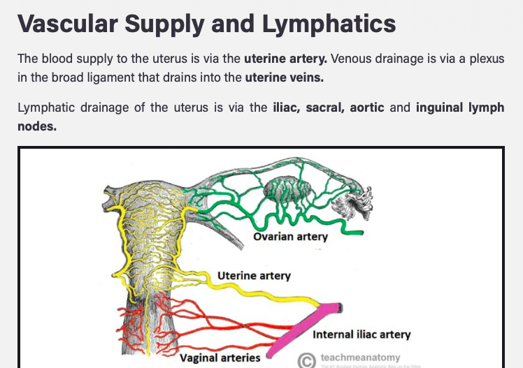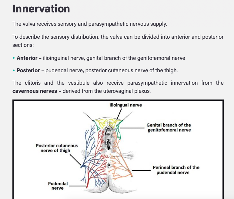 Nerve: Most from autonomic nervous system via uterovaginal nerve plexus. Only inferior 1/5th somatically innervated by deep perineal nerve (branch of pudendal)