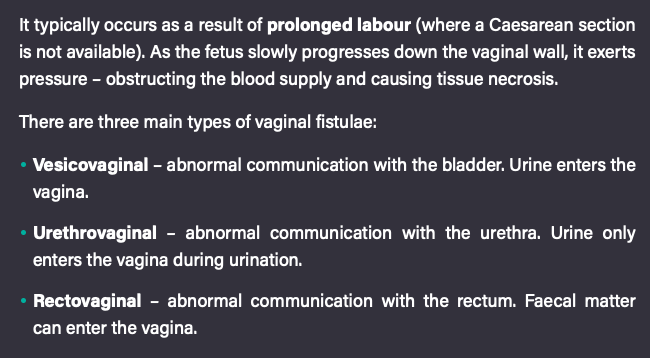 It typically occurs as a result of prolonged labour (where a Caesarean section is not available). As the fetus slowly progresses down the vaginal wall, it exerts pressure – obstructing the blood supply and causing tissue necrosis.