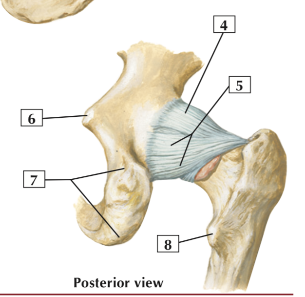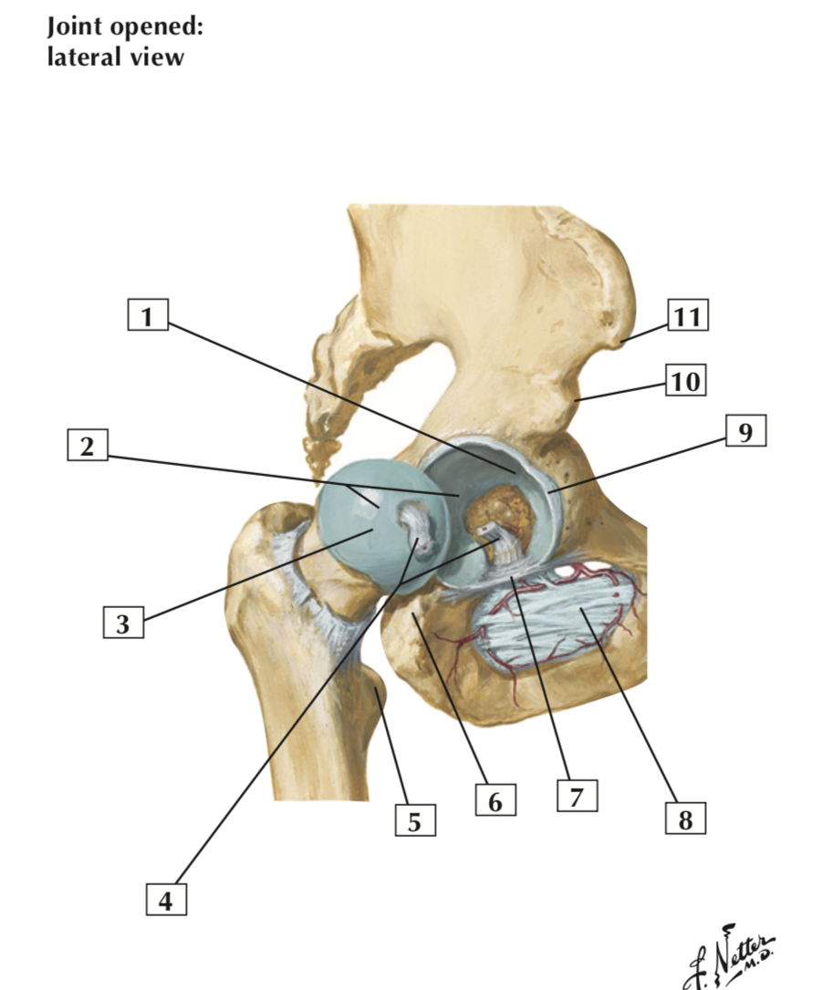The hip joint is a multiaxial ball-and-socket synovial joint between the acetabulum and the head of the femur. T