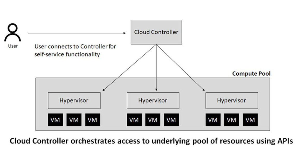 The orchestration enables a controller to request resources from the pools of resources, and all this is automated through the use of APIs (mostly RESTful APIs).