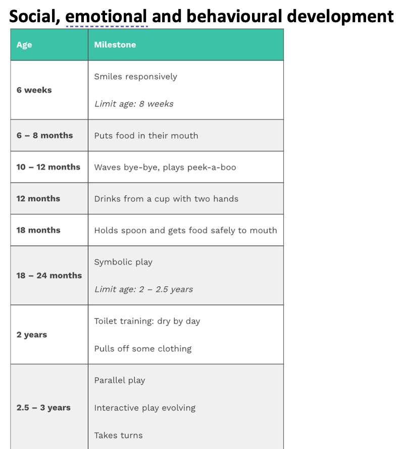 their ‘median age of acquisition’ and ‘limit age’ by which they should have been achieved. If the skill is not attained by this age then more detailed assessment, investigation or intervention may be required.