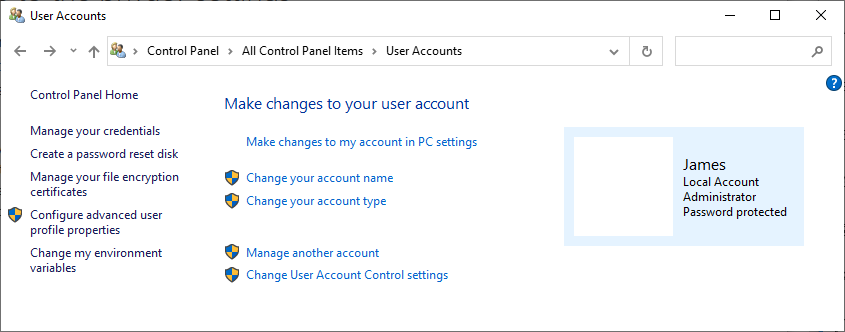 User Accounts Applet in Control Panel allows to change account name, acount privileges, & UAC settings