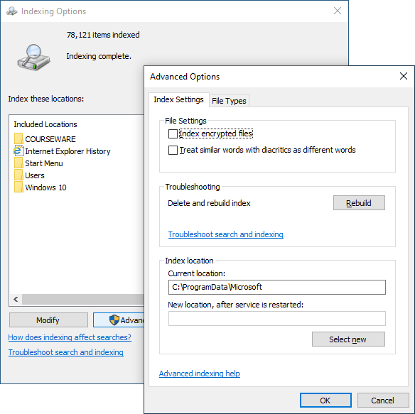 What does the Indexing Options applet in Control Panel do? (2)