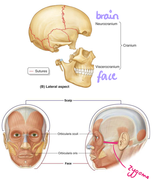 How is the head and neck split into sub-sections?