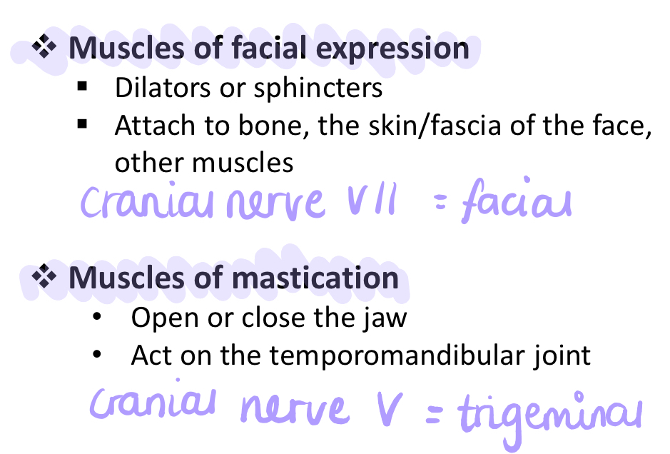 What are the two groups of muscles in the face and what is their nerve supply?